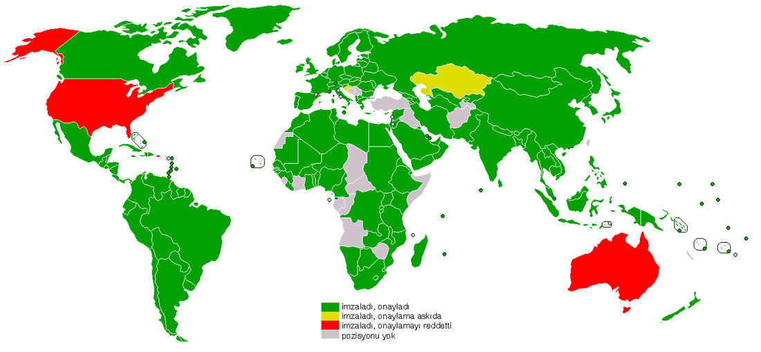 “Kyoto Protokolü gelişmiş ülkelerin sera gazı salınımlarını 1990 yılına göre %5.2 azaltmalarını öngören bir anlaşmadır (protokolün uygulanmaması durumunda 2010 yılı salınım tahminleri dikkate alınırsa bu, %29’luk bir azalmaya karşılık gelmektedir). Amaç altı sera gazının – karbon dioksit, metan, nitröz oksit, kükürt heksaflorür, HFC’ler ve PFC’ler – 2008-2012 arası beş yıllık ortalama salınım değerlerini azaltmaktır. Ulusal hedefler AB ve başka bazı ülkeler için %8’lik, ABD için %7’lik, Japonya için %6’lık azaltma, Rusya için %0 değişiklik ve Avustralya için %8 ile İzlanda için %10’luk bir artış şeklinde çeşitlilik göstermektedir.”